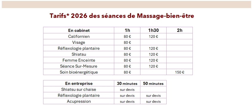 Les prestations de massage-bien-être n’ont aucun but thérapeutique et en raison de leur nature, ne s’apparentent en rien, ni dans les contenus ni dans les objectifs, à la pratique de la masso-kinésithérapie ainsi qu’à toute pratique médicale. Elles de déroulent dans un cadre clair et sans ambiguïté.